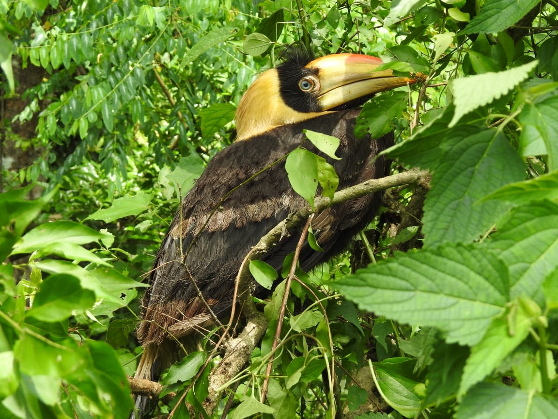A female Great hornbill is perched with a food item in its beak outside the cavity that was occupied by a Wreathed hornbill pair. The blue throat pouch of the Wreathed hornbill is visible in this photograph if you look closely.
