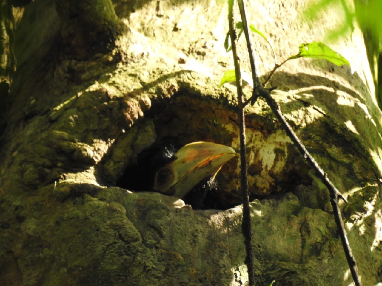 The hornbill breeding season is a very exciting period for us. For the hornbills, though, it is a vulnerable period as the female imprisons herself inside a cavity for 3-4 months until the chick is healthy and ready to fledge. The male hornbill plays a critical role bringing food for the female and the chick(s) to meet their nutritional requirement, while also feeding himself.
